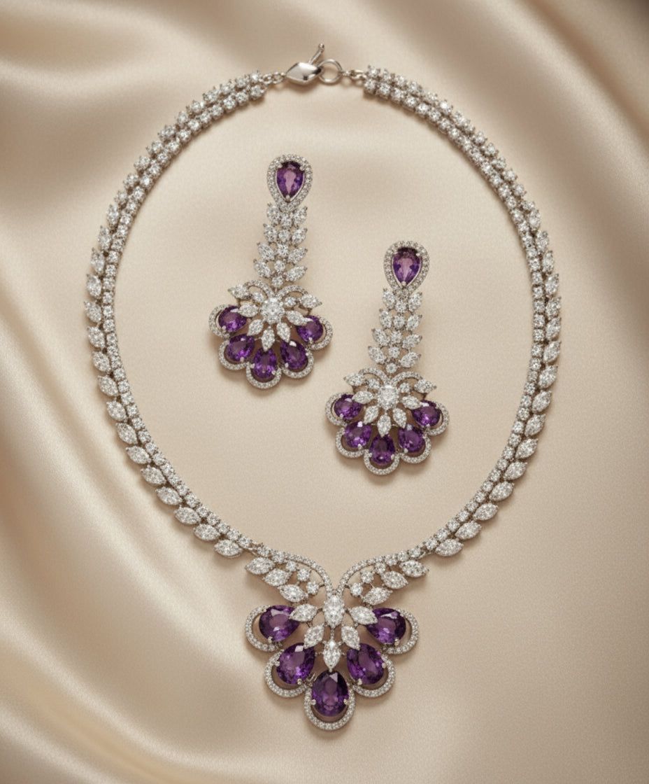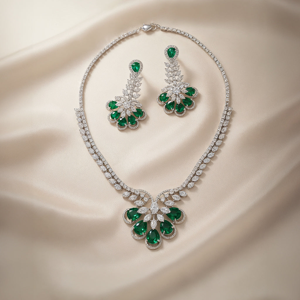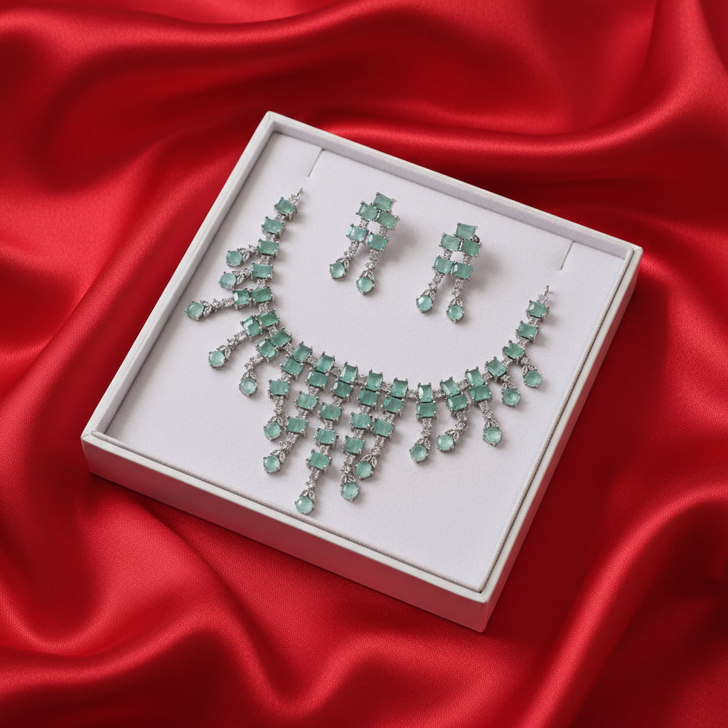 Regular price Rs. 4,999.00Sale price Rs. 4,999.00 Regular price Rs. 7,691.00Unit price / perDescription: This magnificent white stone necklace features bold, pointed motifs arranged in a striking pattern, each adorned with a radiant emerald stone at its center. The...