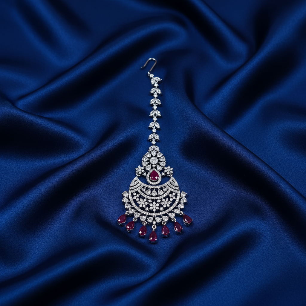 Regular price Rs. 1,699.00Sale price Rs. 1,699.00 Regular price Rs. 2,614.00Unit price / perDescription: This radiant white stone maangtika features a striking crimson red center stone, beautifully complemented by delicate dangling red stones. Its intricate detailing and graceful color...