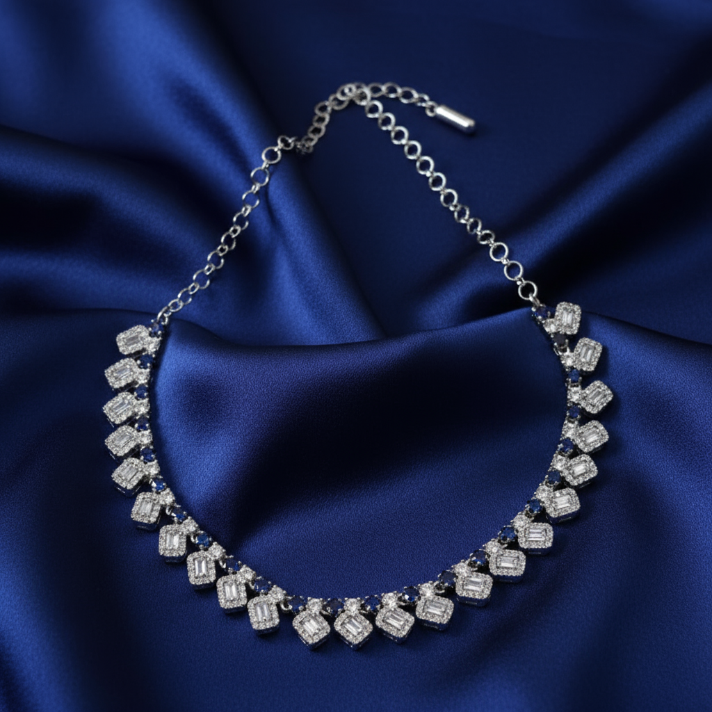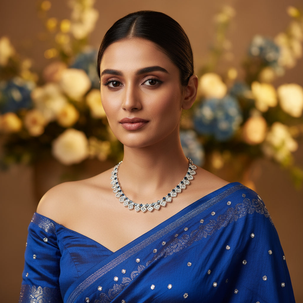 Style Tip: Pair this refined piece with an evening gown, saree, or cocktail dress in neutral or cool tones like silver, navy, or white. Keep your hairstyle sleek and accessories minimal to let the blue stone and radiant white shimmer stand out gracefully.
