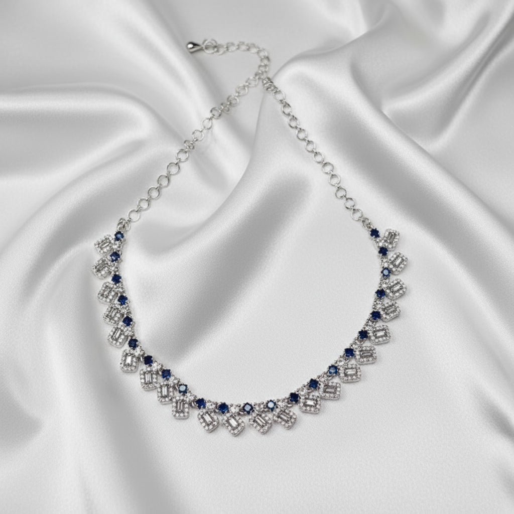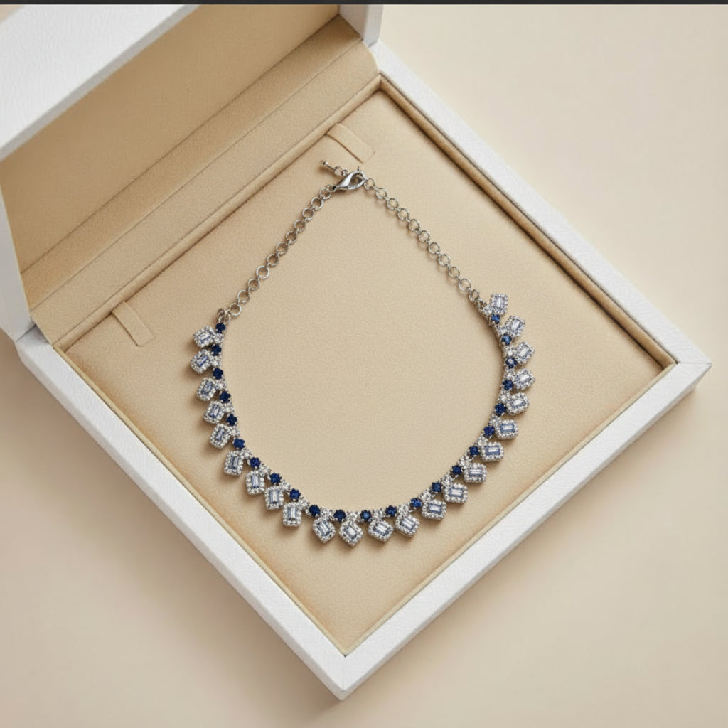 Description: This classic white stone necklace is adorned with a single striking blue stone at the top, adding a touch of color to its timeless sparkle. Elegant and versatile, it perfectly balances simplicity with sophistication, making it suitable for any special occasion.