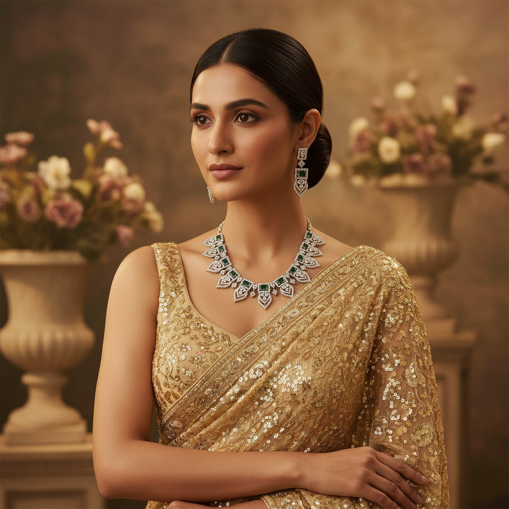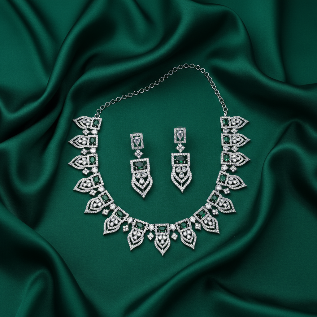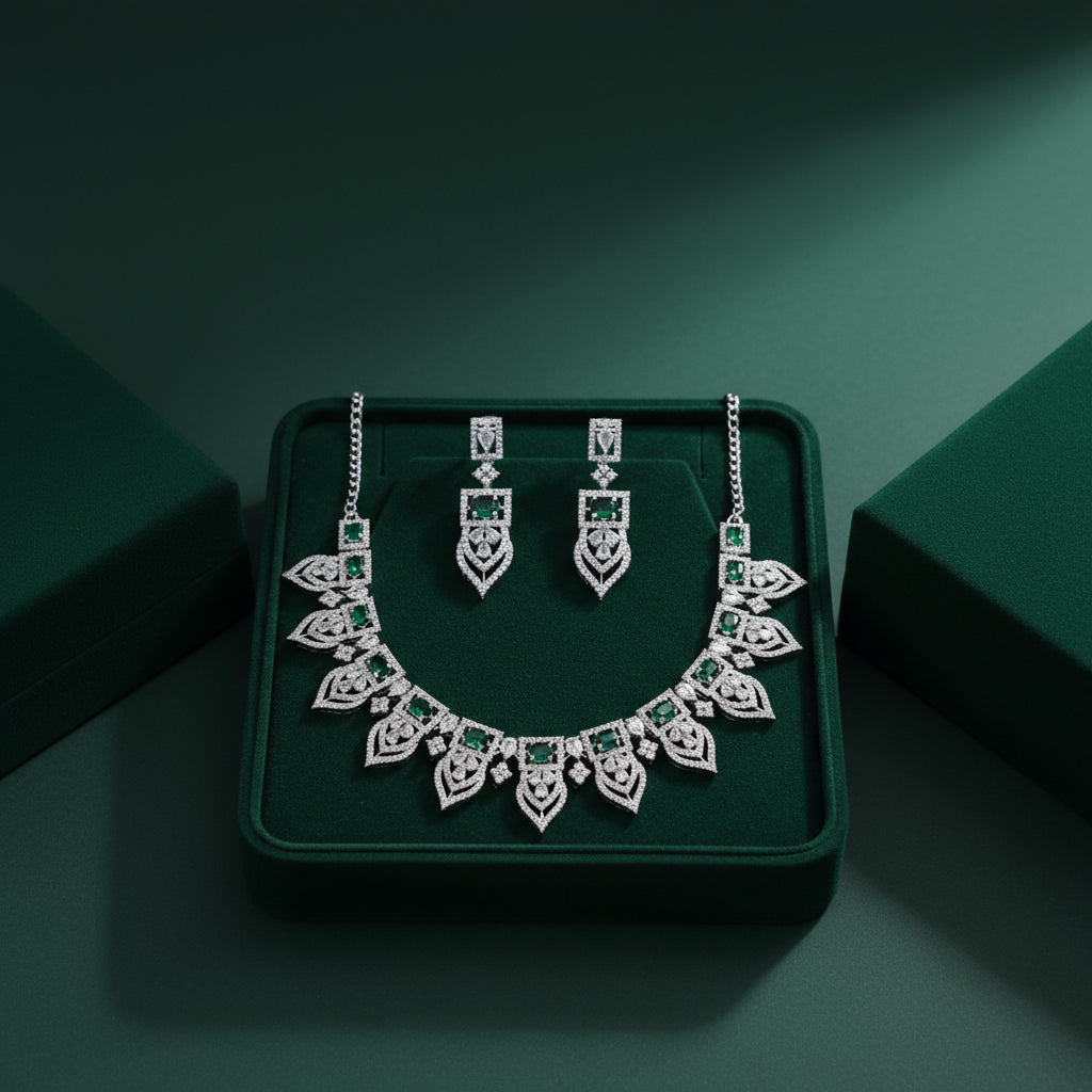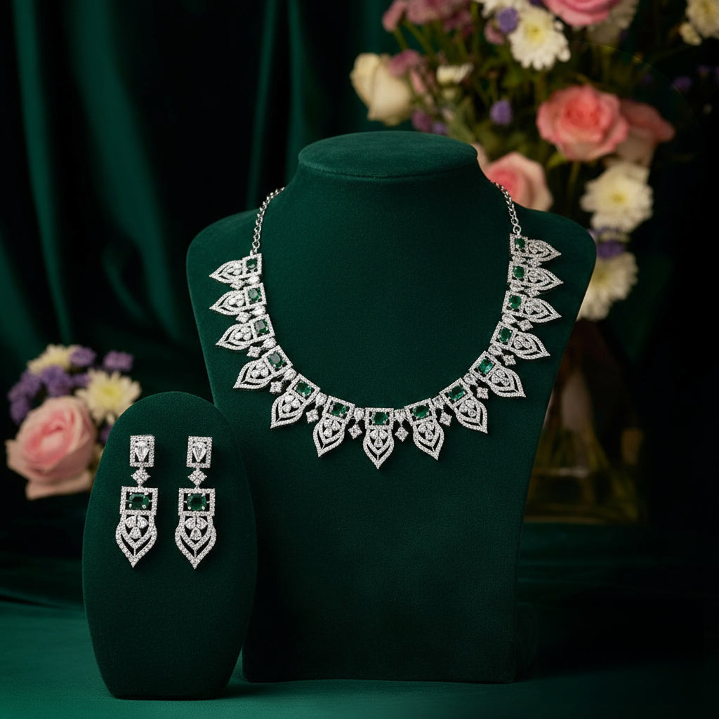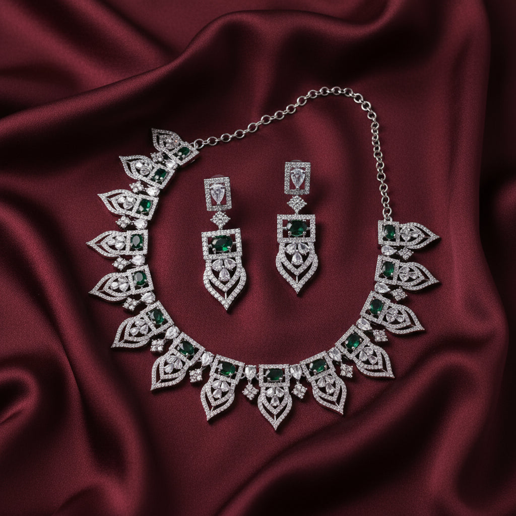 Description: This magnificent white stone necklace features bold, pointed motifs arranged in a striking pattern, each adorned with a radiant emerald stone at its center. The intricate detailing and shimmering finish make it a truly regal and eye-catching heavy piece, perfect for grand occasions.