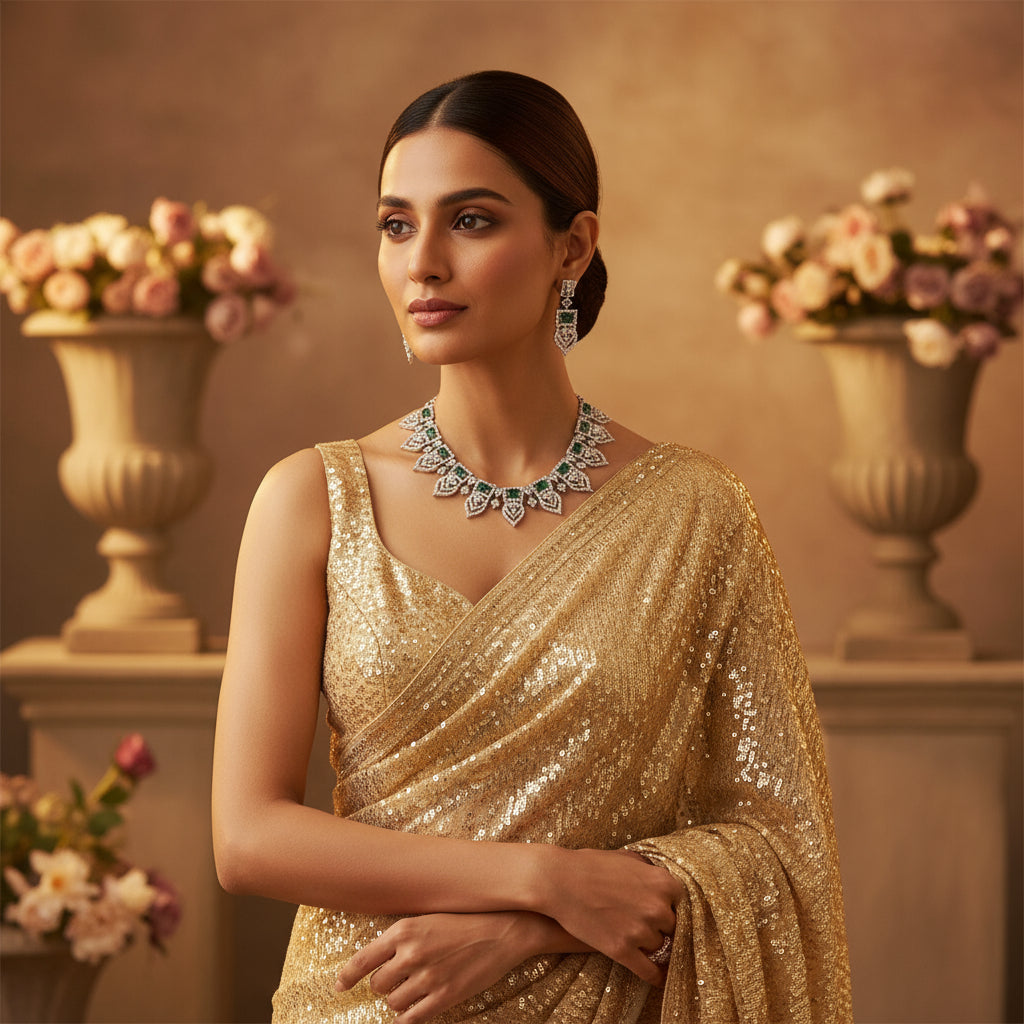 Style Tip: Best paired with traditional attire in rich tones like emerald green, ivory, or maroon, this statement necklace shines when worn with an open or deep neckline. Keep your look balanced with minimal earrings and soft makeup to let its exquisite craftsmanship take the spotlight.