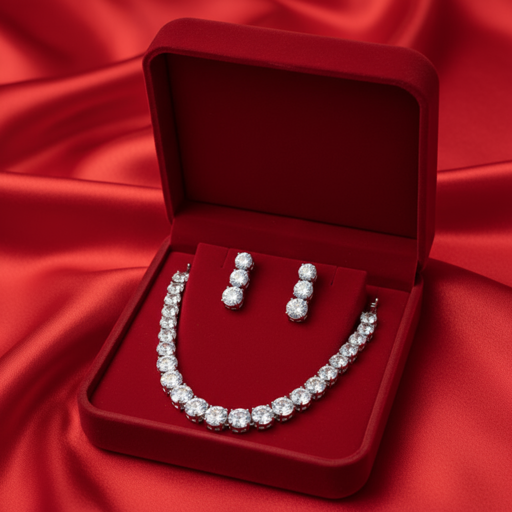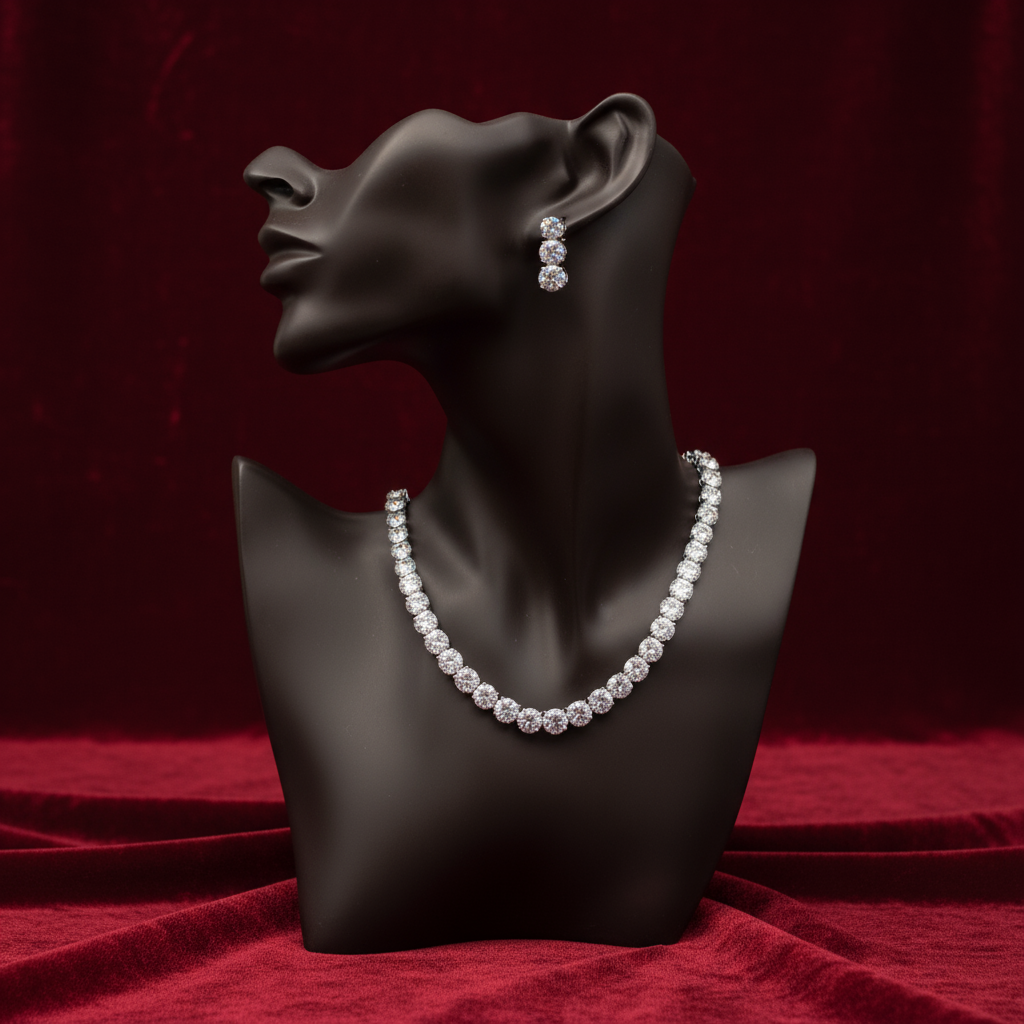 Description: This elegant white stone necklace features a graceful gradient design — with larger stones at the center that gradually taper into smaller ones toward the ends. The matching earrings mirror this charm, featuring three stones arranged from small to big, adding perfect harmony to the set.