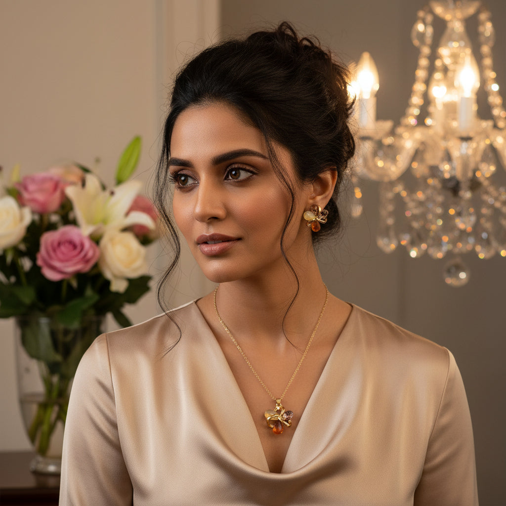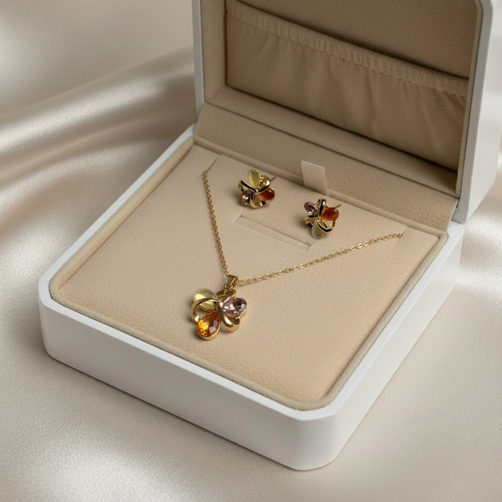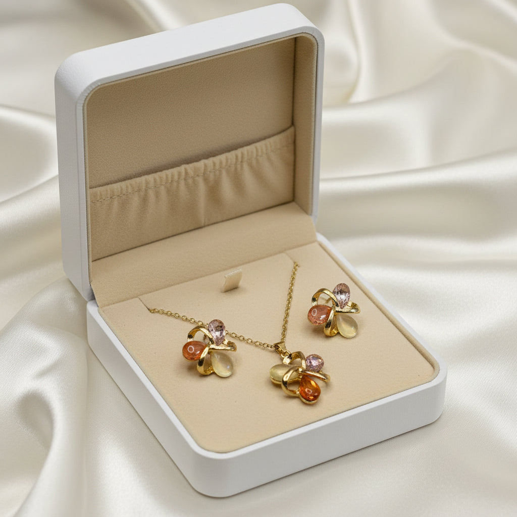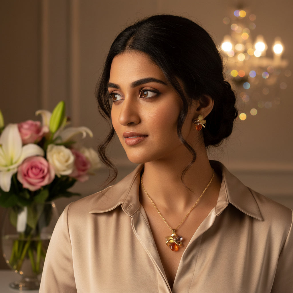 Description: A delicate three-petal flower pendant set adorned with sparkling stones, adding a soft, feminine sparkle to your look. Perfect for both daily wear and special moments.